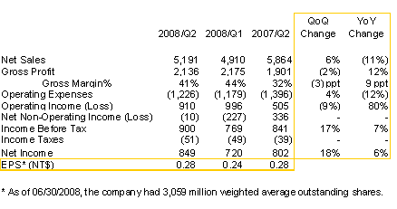 Gross margin for the second quarter 2008 was 41%, a significant improvement from 32% in the second quarter 2007 and at close range of 44% in the first quarter of 2008. Gross profit was NT$2,136 million (US$70.2 million), an increase of 12% year-over-year, and decrease of 2% sequentially.