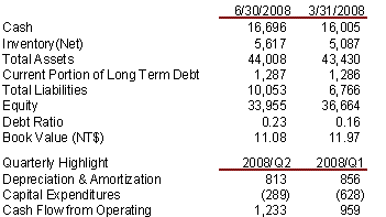 Macronix’s revenue has improved the Company’s cash position. The debt-to-asset ratio is now 0.23 which is higher than 0.16 in first quarter of 2008; the reason is that Dividend Payable for this year is listed in current liability. As of June 31, 2008, the Company had NT$16,696 million (US$548.9 million) in cash and cash equivalents. With the inclusion of restricted deposits, the cash position would have been NT$18,127 million (US$595.9 million). Net inventory increased by NT$530 million (US$17.4 million) to NT$ 5,617 million (US$184.7 million), compared to NT$5,087 million (US$167.2 million) for the first quarter of 2008.