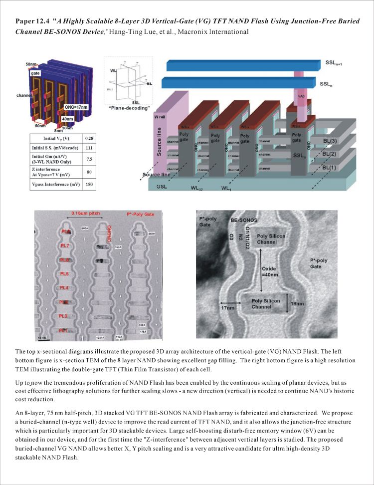In this paper, Macronix reports the fabrication and demonstration of an 8-layer, 75nm half-pitch, 3D VG (Vertical Gate) NAND Flash using a junction-free BE-SONOS device. The BE-SONOS charge-trapping device provides both high reliability and simple structure suitable for 3D. At an equivalent 0.0014 (μm) 2 cell size (near world record), Macronix’s 3D VG NAND has shown no Z-directional interference, large read current, and large program window (7V) for MLC (Multi-level Cell) operation.